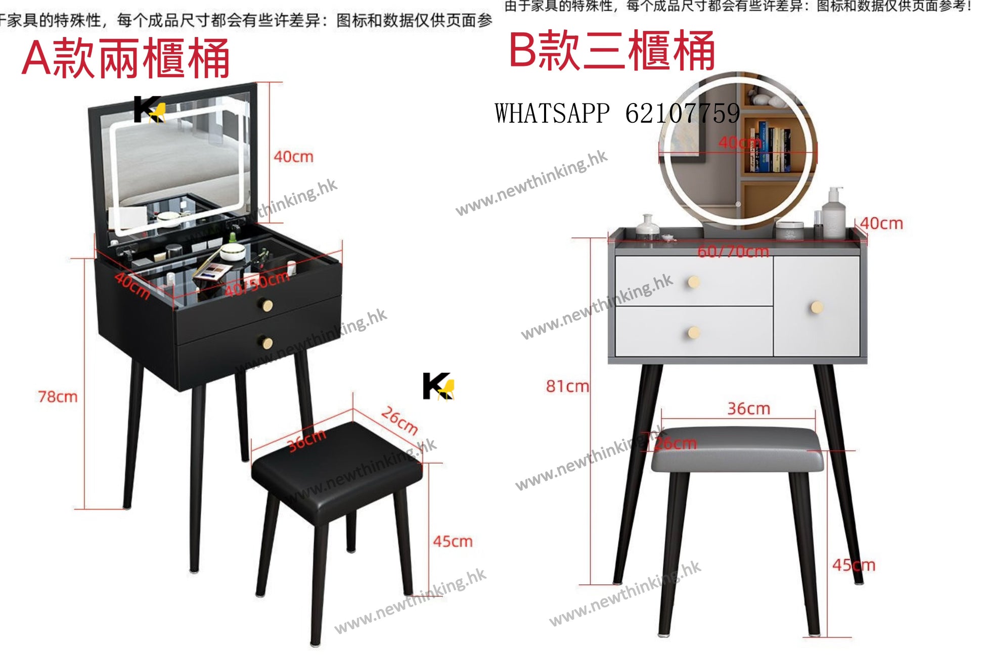 A&1876簡易梳妝枱 小型迷你化妝枱 化妝品收納櫃 床頭櫃 梳妝桌 化妝桌 40cm/60cm/70cm桌子